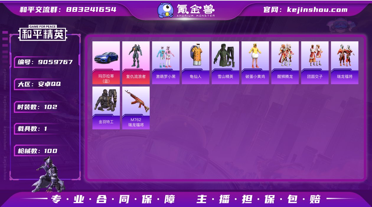 DYH17216【1粉装1特效1载具 玛莎拉蒂 流浪者 雪山精英 激萌罗小黑 金羽特工】 安卓Q-32404热力值 4王牌印记 历史超级王牌2星 102 100枪皮 【1载具】 玛莎拉蒂蓝色 【1粉装】 复仇流浪者 【1特效枪】 Kar98K-巳巳如意 (3级) 【11热门】 龟仙人 雪山精英 激萌罗小黑 金羽特工 醒狮腾龙 团圆交子 瑞龙福将 破蛋小黄鸡 极速红龙 弄潮海豚 M762-瑞龙福将 角色-复仇流浪者 至尊龙雀降落伞 马卡龙降落伞 暗夜玫瑰降落伞 暗星紫秘降落伞 玛莎拉蒂Ghibli(蓝) Kar98K-巳巳如意 -特训学院 -猎鹰 -青年教官 -橘黑制服 -红色运动 -黄色运动 -蓝色运动 -黄色伏地魔 -白色伏地魔 -黑色伏地魔 -竞技名士 -深蓝色名流 -酒红色名流 -湖蓝色名流 -黄色名流 -猛禽 -长空猛禽 -竞技勇士朋克 -冷焰舞者 -灼焰舞者 -战地督导 -甜蜜告白 -滨海假日 -完美偶像 -人气偶像 -幻影武者 -街头潮人 -蓝彩潮人 -怒火燎原 -魅力单车 -绮丽涂鸦 -雪山征服者 -竞技达人朋克 -金羽特工 -破晓战魂 -都市魅力 -雪山精英 -传奇侦探 -幻世战舞者 -金耀舞者 -精密机核 -弄潮海豚 -甜蜜熊情侣 -缤纷果语 -元素星魂 -极速红龙 -格斗先锋 -破蛋小黄鸡 -疯狂小兔子 -圣诞大吉 -冰原使者 -凛冬战士 -北国孤狼 -SS6特训 -跃动心情 -SS7特训 -鹤鸣 -霓虹街区 -激萌罗小黑 -白熊同盟 -夏日音浪 -SS9特训 -探宝勇士 -牛气满满 -白糯汤圆 -战术大师 -牛气冲天 -耀粉歌者 -天籁歌者 角色-艾克斯奥特曼 -SS16特训 -SS17特训 -醒狮腾龙 -瑞龙福将 -团圆交子 -冰川谧蓝 -福星高照 -虎虎生威吉莉 -异彩先驱 -霓虹极客 -空投萌叽 -甜心亚梦 -虚音幻奏 -SS21特训 -萌趣咩咩 -娇憨猪猪 -玉兔迎春 -SS22特训 -绯格组合 粉色滑翔尾迹 -龟仙人 -空岛之星 -SS27特训 -老实芭蕉 -SS28特训 -海盐绵绵冰 -巳巳如意 AKM-破晓