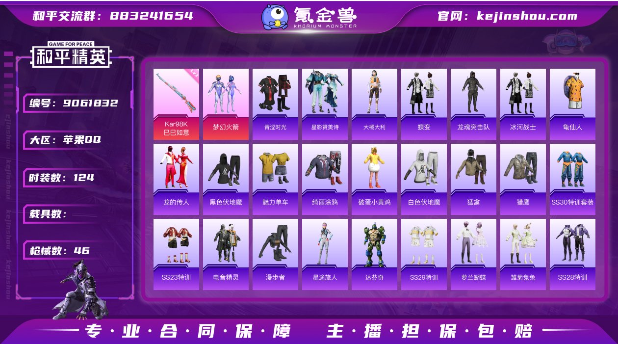 实名: 可修改 时装数: 124 枪械数: 46 战备数: 37 热门装扮: 梦幻火箭(新101) 稀有枪皮: Kar98K-巳巳如意-连体号 王者贵6 英雄数量:103 皮肤数量:102 珍品传说皮肤:怪盗基德 热门限定:愿照·九州拓,器灵·浮梦炉,埋骨钱, 限定传说:猫狗日记男,时之恋人女,未来纪元,云霓雀翎,黄金白羊座,魅语,幻光神枪,