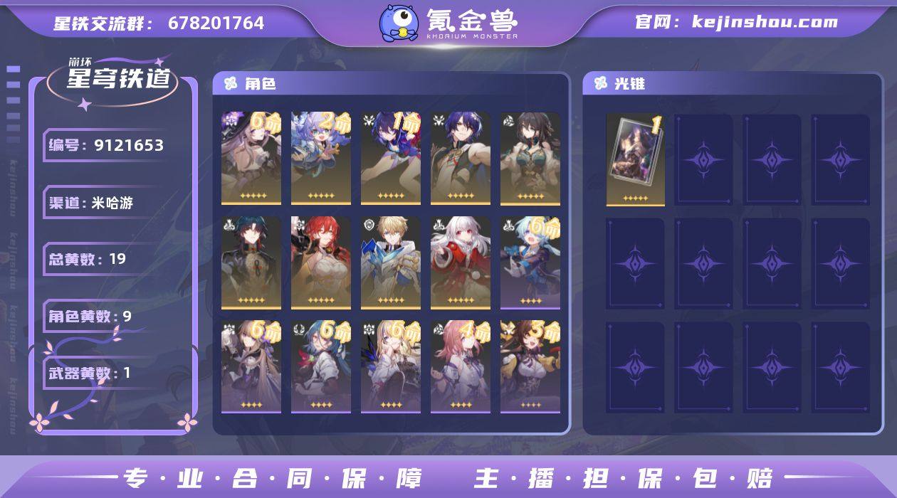 总黄数: 19 6命金色角色: 6命大黑塔 2命金色角色: 2命白露 1命金色角色: 1命希儿 0命金色角色: 0命姬子,0命克拉拉,0命杰帕德,0命刃,0命阮•梅,0命真理医生 精1武器: 精1向着不可追问处