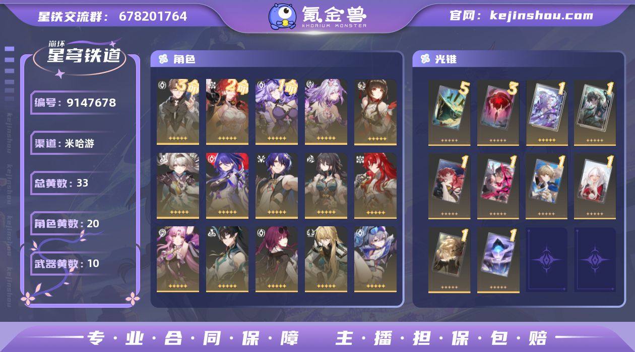 总黄数: 33 3命金色角色: 3命瓦尔特 2命金色角色: 2命姬子 1命金色角色: 1命黑天鹅 0命金色角色: 0命希儿,0命彦卿,0命白露,0命布洛妮娅,0命杰帕德,0命银狼,0命罗刹,0命卡芙卡,0命丹恒•饮月,0命符玄,0命银枝,0命阮•梅,0命真理医生,0命黄泉,0命流萤,0命灵砂,0命遐蝶 精5武器: 精5星海巡航 精3武器: 精3记一位星神的陨落 精1武器: 精1如泥酣眠,精1制胜的瞬间,精1以世界之名,精1无可取代的东西,精1银河铁道之夜,精1比阳光更明亮的,精1记忆的质料,精1让告别,更美一些