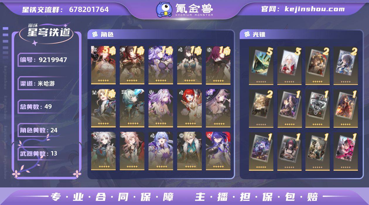 总黄数: 49 3命金色角色: 3命姬子 1命金色角色: 1命彦卿,1命卡芙卡,1命阮•梅,1命黑天鹅,1命忘归人 0命金色角色: 0命白露,0命瓦尔特,0命布洛妮娅,0命克拉拉,0命杰帕德,0命罗刹,0命藿藿,0命真理医生,0命花火,0命黄泉,0命砂金,0命知更鸟,0命飞霄,0命椒丘,0命大黑塔,0命缇宝,0命遐蝶,0命那刻夏 精5武器: 精5星海巡航 精3武器: 精3无可取代的东西 精2武器: 精2如泥酣眠,精2但战斗还未结束,精2镜中故我 精1武器: 精1拂晓之前,精1制胜的瞬间,精1以世界之名,精1只需等待,精1重塑时光之忆,精1游戏尘寰,精1行于流逝的岸,精1向着不可追问处