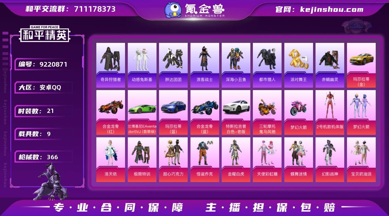 安卓手Q-22王牌印记-41粉装-21特效枪-9载具-热力值-305套装-366枪皮-3卓越印记-2传奇印记 【41粉装】,梦幻火箭,2号机款机体服,甜心巧克力,宝贝奶油派,天使彩虹糖,缤纷油彩,放客神游,新星烈龙,灵感创作师,童趣迷兔,蝶舞迷情,第五大道,洛天依,怪诞乔克,极致幻想,金曜白虎,暗夜玫瑰,古堡领主,甜蜜誓约,复仇流浪者,黄蜂伯爵,橘柚倾心,薄荷物语,天禅智恒,狩月元帅,迷蝶贵族,向日葵,暖熊萌萌,甜梦小狐,俏皮狐尾,冰霜白皇,炙焰红王,极限特训,金风玉露,山涧鹿灵,苍蓝魅影,绚金战神,香水柠檬,幻影战神,星之彼岸,齐天大圣 【21特效枪】AKM-炫紫旋律-1级 AKM-盖世英雄-9级 SCAR-L-梦幻火箭-1级 SCAR-L-童趣迷兔-4级 SCAR-L-天蓬元帅-8级 M416-心之恋语-3级 M416-五爪金龙-2级 M416-至情至圣-8级 GROZA-香水柠檬-5级 AUG-星之彼岸-5级 M762-甜蜜誓约-7级 M762-激战未来-1级 Kar98K-巳巳如意-5级 Kar98K-伏魔团-4级 AWM-橘柚倾心-5级 SLR-暗夜玫瑰-4级 UMP45-雪国精灵-7级 Vector-环太平洋-7级 汤姆逊-怪笑疯兔-3级 DP-28-扶摇飞仙-5级 MG3-洛神天依-4级 【21稀有紫装】,都市猎人,派对舞王,赤蝎幽灵,萌熊伴侣背包(3级),奇异狩猎者,暗影哥特,深海小丑鱼,浪漫天命,雪山精英,浪漫波比,迅捷狂鲨,胖达团团,明日香款战斗服,小丑鱼,龟仙人,暗夜魅影,巡查衣,金羽特工,萌熊伴侣背包(2级),真嗣款战斗服,东方飞龙, 【9稀有载具】,玛莎拉蒂Quattroporte(幻星粉)/6级,玛莎拉蒂Ghibli(金),玛莎拉蒂Ghibli(蓝),特斯拉Model X(珍珠白),兰博基尼Aventador SVJ(翡翠绿),合金龙骨(红),合金龙骨(蓝),双人摩托-梦幻火箭,鬼马风驰, 【1僚机】,空客H135-蔚蓝之翼, 【306稀有时装】,绝对防御上衣,SS31特训,SS33特训,SS32特训,恋语绒绒,星渊小夜