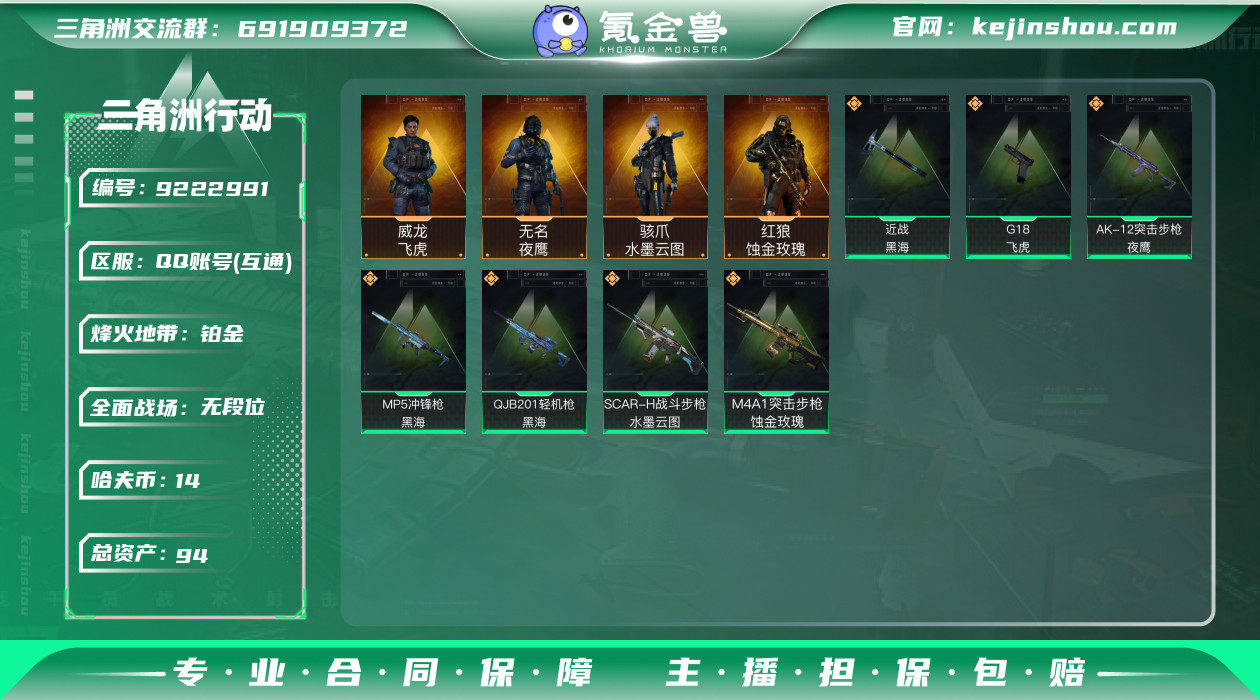 hf5730 总资产94m+纯币14m+饰金玫瑰红狼全套+水墨云图骇爪全部套+黑海全套+飞虎全套+s4赛季通行证+烽火等级60 特勤部门等级高 永久包赔