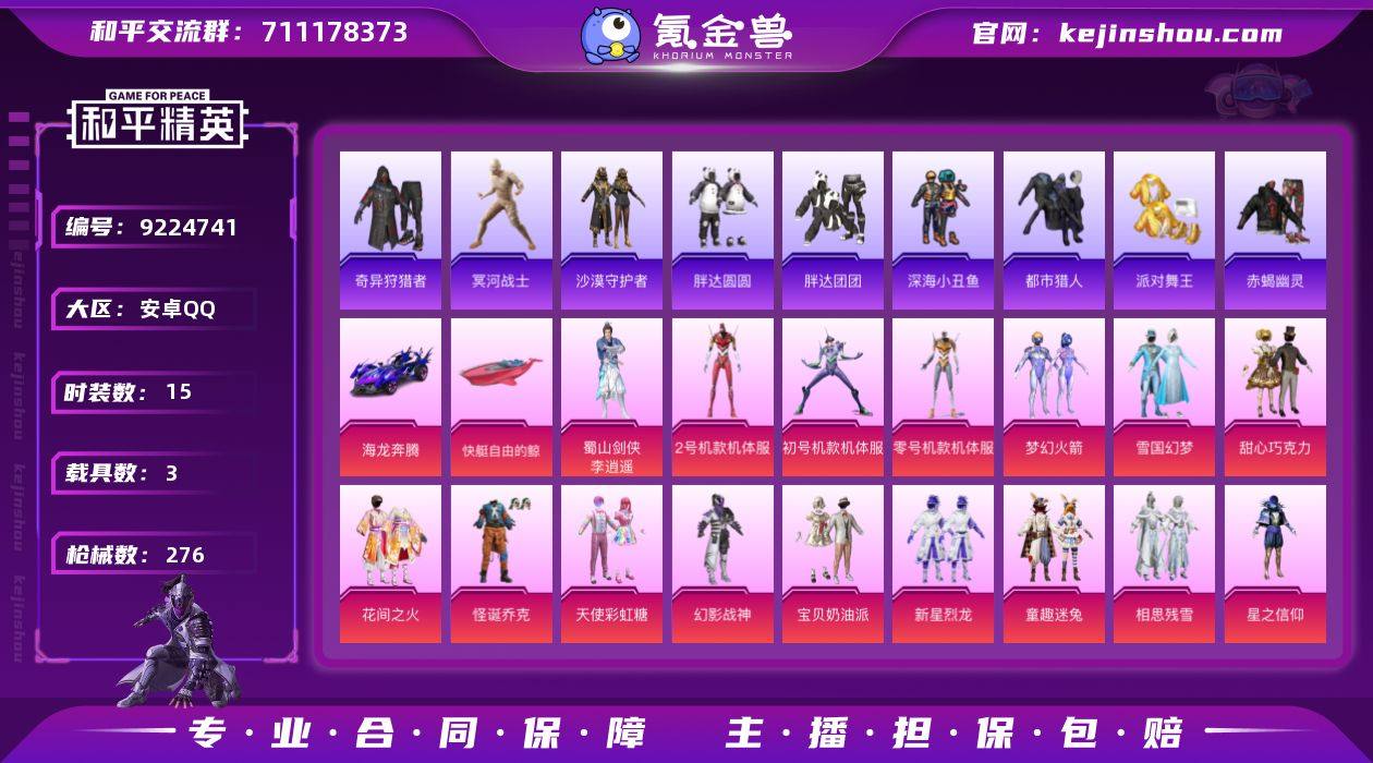 安卓手Q-12王牌印记-60粉装-15特效枪-3载具-热力值-271套装-276枪皮-0卓越印记-0传奇印记 【60粉装】,雪国幻梦,梦幻火箭,零号机款机体服,初号机款机体服,2号机款机体服,甜心巧克力,宝贝奶油派,天使彩虹糖,千面幻镜,新星烈龙,灵感创作师,童趣迷兔,怪诞乔克,彩虹甜喵,恐龙拽拽,花间之火,暗夜玫瑰,红伞翩翩,黄伞悠悠,黑伞漫漫,沙场疾风,星之信仰,海渊国主,复仇流浪者,焦糖拿铁,流星咚咚,精灵娃娃,酣梦娃娃,绚金瑰梦,薄荷物语,赤焰黑爵,紫电风暴,傲雪凌霜,霁雪冰心,暖熊萌萌,圣光天使,霞光圣骑,寒光使者,甜梦小狐,冰川粉黛,冰川幽秘,冰川红玫,旋转彩虹,甜蜜草莓,鸾凤武仙,朗月武圣,冰霜白皇,炙焰红王,李逍遥,铁血龙王,林间仙鹿,彩虹鹿灵,山涧鹿灵,天之羽翼,星夜魔法师,未来歌姬,蜜桃特工,蝶舞蔷薇,幻影战神,相思残雪 【15特效枪】AKM-梦之光华-5级 SCAR-L-童趣迷兔-5级 SCAR-L-青春物语-1级 M416-至情至圣-8级 M416-心之恋语-3级 GROZA-旋转彩虹-5级 M762-冷魅冰骑-4级 Kar98K-巳巳如意-5级 SLR-暗夜玫瑰-3级 UMP45-恐龙拽拽-6级 P90-甜蜜草莓-5级 S12K-海渊国主-4级 M249-彩虹甜喵-1级 M249-蓝莓炮弹-4级 MG3-炙焰牛王-4级 【22稀有紫装】,冥河战士,都市猎人,派对舞王,赤蝎幽灵,萌熊伴侣背包(3级),奇异狩猎者,暗影哥特,深海小丑鱼,沙漠守护者,浪漫天命,雪山精英,胖达圆圆,浪漫波比,迅捷狂鲨,胖达团团,明日香款战斗服,小丑鱼,龟仙人,金羽特工,萌熊伴侣背包(2级),零款战斗服,真理款战斗服, 【3稀有载具】,玛莎拉蒂Quattroporte(幻星粉)/5级,海龙奔腾,快艇-自由的鲸/1级, 【272稀有时装】,SS31特训,SS33特训,SS32特训,恋语绒绒,大橘大利,沙漠守护者,都市猎人,胖达团团,浪漫天命,奇异狩猎者,龟仙人,雪山精英,暗影哥特,深海小丑鱼,小丑鱼,金羽特工,迅捷狂鲨,零款战斗服,明日香款战斗服,胖达