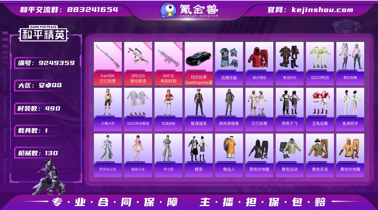 安卓Q-39415热力值 3王牌印记 历史超级王牌2星 116套装 130枪皮 【1载具】 玛莎拉蒂Q蓝色 【3特效枪】 M416-电玩时刻 (5级) Kar98K-巳巳如意 (5级) GROZA-镜光银凌 (5级) 【10热门】 龟仙人 迅捷狂鲨 醒狮腾龙 团圆交子 瑞龙福将 破蛋小黄鸡 极速红龙 弄潮海豚 M762-瑞龙福将 M24-香水柠檬 【1头盔】 梦幻火箭头盔 营地ID:933281329