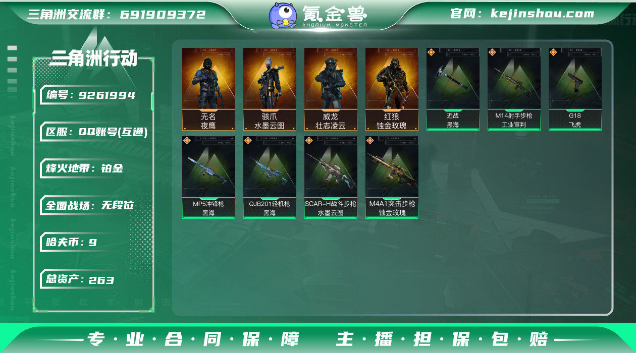 hf5837 总资产263m+纯币9m+饰金玫瑰红狼全套+水墨云图骇爪+黑海全套+s3s4s5赛季通行证+烽火等级60 特勤部门等级高 永久包赔