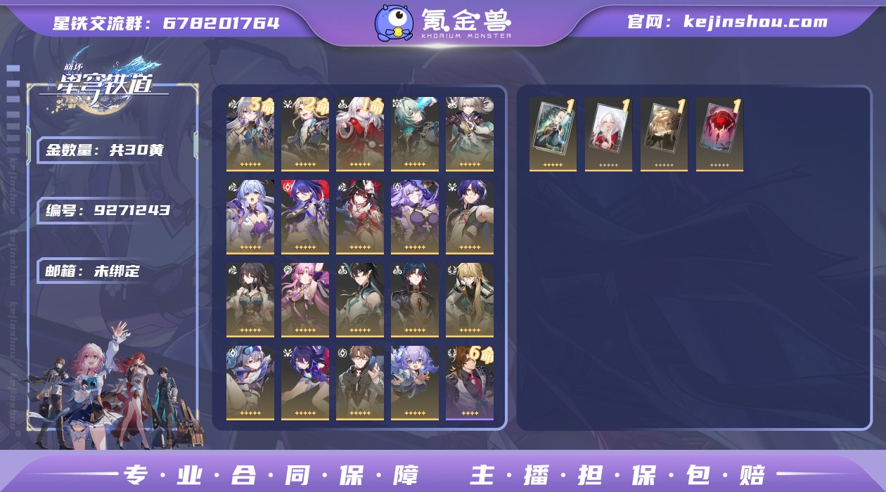 角色:20个黄,22个紫 光锥四个黄元老级uid