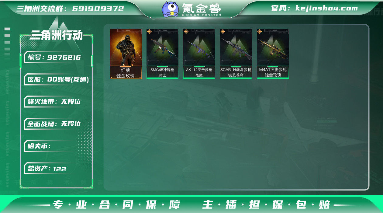 DSJ512 三端互通 蚀金玫瑰 段位黄金 训练中心Lv.6 行动等级60 资产122M 哈弗币55212K M4A1突击步枪-蚀金玫瑰 AK-12突击步枪-夜鹰 SMG-45冲锋枪-骑士 SCAR-H战斗步枪-铁艺苍穹 可二次 三角洲行动账号 【哈夫币物品官方控价存在上下浮动,以游戏内截图为准,介意勿拍】