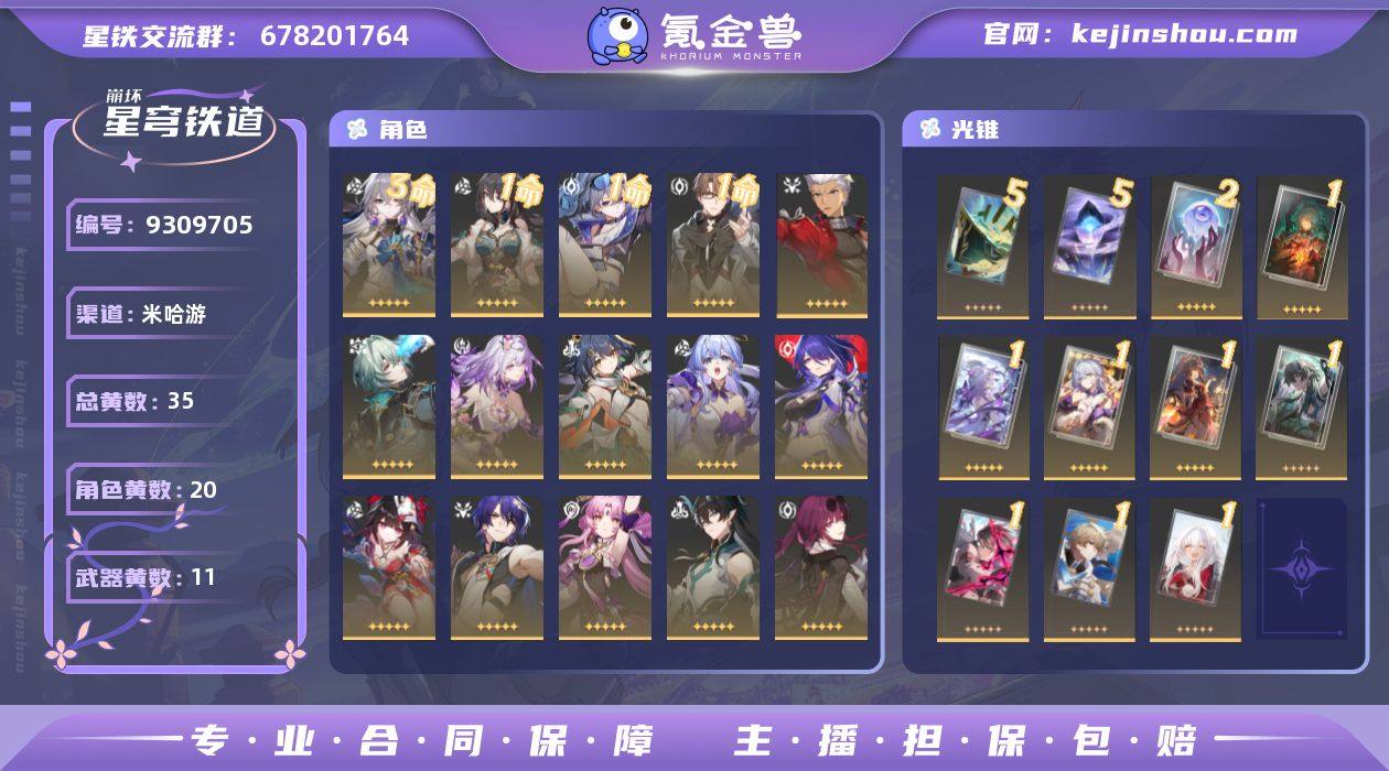 总黄数: 35 3命金色角色: 3命布洛妮娅 1命金色角色: 1命瓦尔特,1命银狼,1命阮•梅 0命金色角色: 0命希儿,0命白露,0命克拉拉,0命杰帕德,0命刃,0命卡芙卡,0命丹恒•饮月,0命符玄,0命真理医生,0命花火,0命黄泉,0命知更鸟,0命云璃,0命遐蝶,0命那刻夏,0命Archer 精5武器: 精5记忆的质料,精5星海巡航 精2武器: 精2记忆永不落幕 精1武器: 精1制胜的瞬间,精1以世界之名,精1无可取代的东西,精1比阳光更明亮的,精1游戏尘寰,精1夜色流光溢彩,精1让告别,更美一些,精1生命当付之一炬