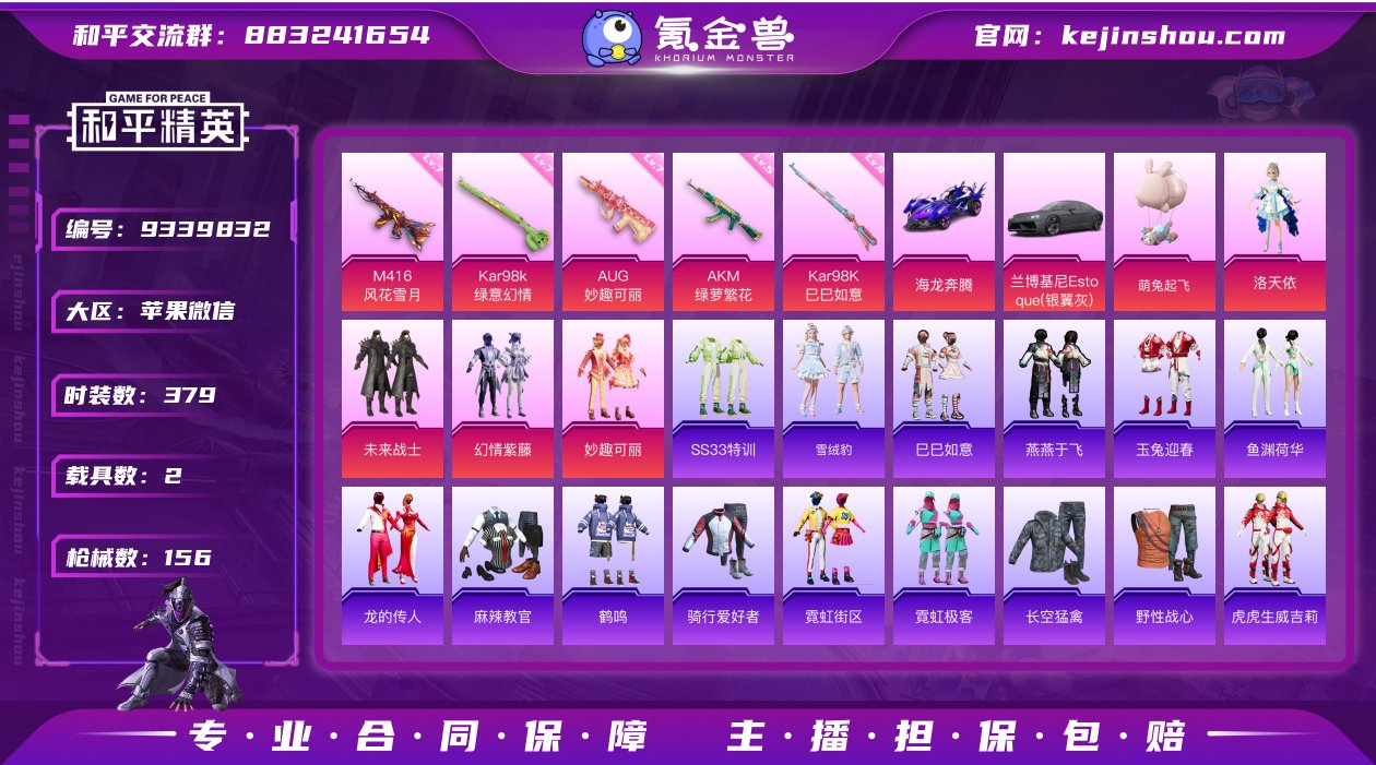 实名: 可修改 时装数: 379 载具数: 2 枪械数: 156 战备数: 117 热门装扮: 洛天依,未来战士,幻情紫藤,妙趣可丽 载具: 海龙奔腾,兰博基尼Estoque(银翼灰),僚机-萌兔起飞 稀有枪皮: Kar98K-巳巳如意,M416风花雪月,Kar98k绿意幻情,AUG妙趣可丽,AKM绿萝繁花 紫色装扮: 雪绒豹,SS33特训套装,巳巳如意,鱼渊荷华,玉兔迎春,燕燕于飞,田园牧歌,和煦暖阳,麻辣教官,鹤鸣,骑行爱好者,SS22特训,幻彩翩翩,飞狐塔尔斯,妙红点点,SS23特训,浪漫假日,SS30特训套装,SS31特训套装,龙的传人,轻风白浪,缤纷焰火,异彩先驱,SS18特训,SS17特训,豚鼠丹丹,飞驰魅影,音速流光,醒狮腾龙,SS19特训,团圆交子,瑞龙福将,娇憨猪猪,萌趣咩咩,暖心熊熊,SS21特训,SS20特训,香草威化,甜心亚梦,虚音幻奏,猎梦纪元,牛气冲天,炫蓝之夏,牛气满满,沙漠兵团,涂山之恋,滨海假日,绮丽涂鸦,缤纷果语,空投萌叽,王牌教练,甜蜜告白,甜蜜熊情侣,空岛之星,幻世战舞者,荣耀,霓虹街区,霓虹极客,长空猛禽,夏日音浪,格斗先锋,探宝勇士,柠萌假日,蓝色运动,野性战心,虎虎生威吉莉,青团波波,糖糖葫芦,竞技名士,街头风暴,绯格组合,先驱飞行员,星途旅人,青玉碎影,萌黄之夏,光之冒险,焰鹰斗篷,幻羽潜行,SS27特训,快闪甜心,SS26特训,春光漫游,明鸳圣池,雏菊兔兔,萝兰蝴蝶,SS29特训,纯真浪花,热情海星,SS28特训,创世·追猎,神气柴柴,懵萌河马,SS24特训,惊鸿侠骨,SS25特训,锦衣飞扬,金戈铁马,粉红小猪,日照花林 亮点: 和平精英