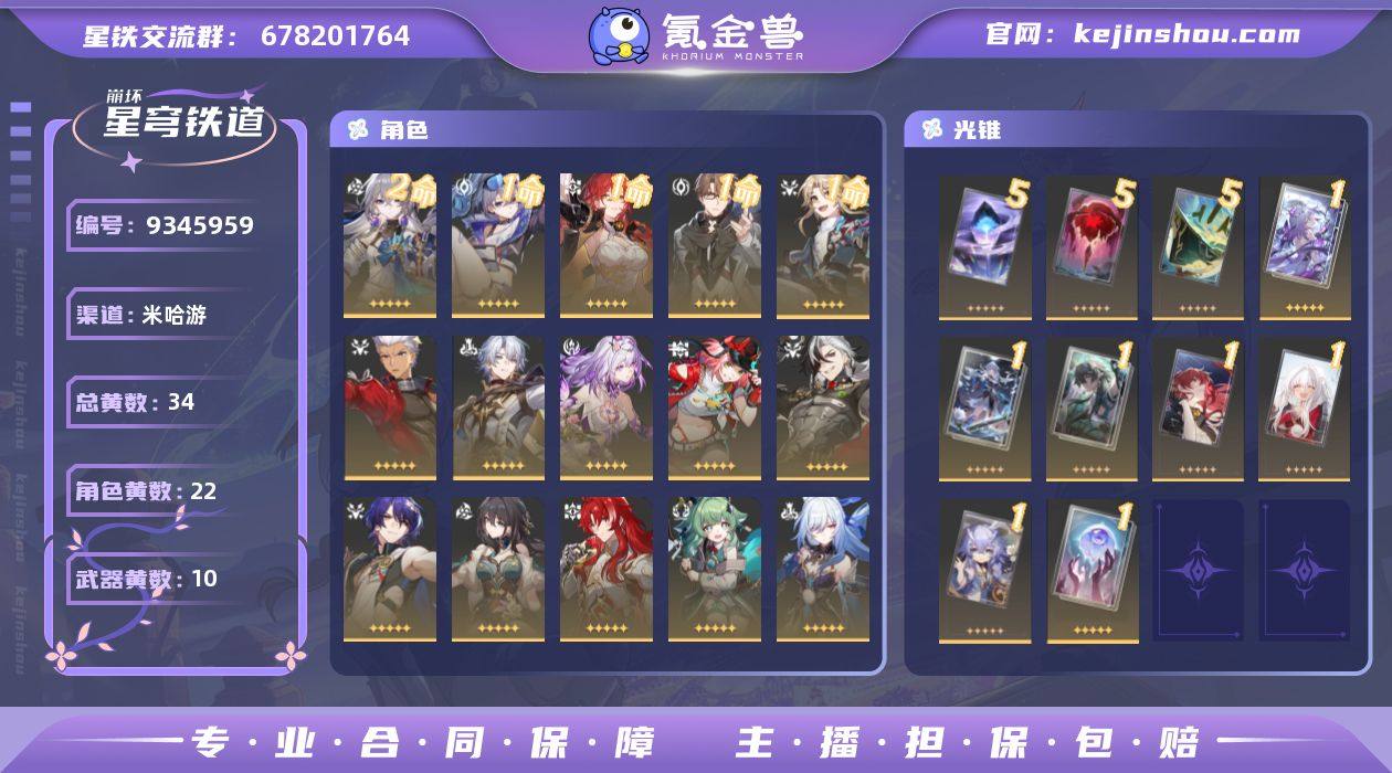 总黄数: 34 2命金色角色: 2命布洛妮娅 1命金色角色: 1命彦卿,1命姬子,1命瓦尔特,1命银狼 0命金色角色: 0命希儿,0命白露,0命克拉拉,0命杰帕德,0命罗刹,0命丹恒•饮月,0命符玄,0命镜流,0命藿藿,0命银枝,0命阮•梅,0命真理医生,0命波提欧,0命乱破,0命遐蝶,0命白厄,0命Archer 精5武器: 精5记忆的质料,精5记一位星神的陨落,精5星海巡航 精1武器: 精1时节不居,精1无可取代的东西,精1银河铁道之夜,精1比阳光更明亮的,精1此身为剑,精1记忆永不落幕,精1让告别,更美一些