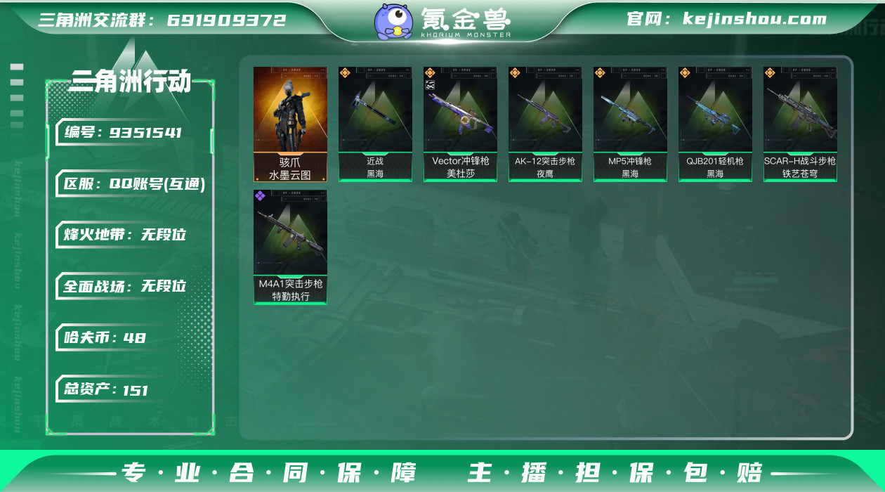 可二次 可修改实名 实名:可修改 烽火地带段位:无段位 全面战场段位:无段位 总资产(M):151.8 哈夫币:48.867 传说武器皮肤:近战-黑海,Vector冲锋枪-美杜莎,SCAR-H战斗步枪-铁艺苍穹,QJB201轻机枪-黑海,MP5冲锋枪-黑海,AK-12突击步枪-夜鹰 史诗武器皮肤:M4A1突击步枪-特勤执行 干员外观:骇爪-水墨云图