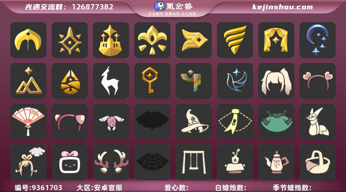 账号类型: 手机账号 季节已毕业: 圣岛季,预言季,梦想季,风行季,潜海季,表演季,集结季,夜行季,拾光季,归巢季,九色鹿季,筑巢季,彩染季,青鸟季 完成地图: 晨岛,云野,雨林,霞谷,暮土,禁阁,全图毕业 珍稀物品: 阿努比斯(狗头),白枭 礼包: 蝙蝠套,巫师,围巾,星球斗,小狐狸,绊爱,大铁头,鹿角,蜘蛛斗,秋千,茶桌,茶壶,餐桌,白绒金,瑞雪,女巫裙,小船,吉他,彩虹帽,雪花球,绒帽,橘子,贝壳,黄伞,南瓜,雪花,tgc,新年裤,四叶草,新年耳钉,创始人,海龟斗篷,献瑞折扇礼包,渐变双马尾发型礼包,心心相印发饰礼包,粽子发饰礼包 裤子: 武士裤,背带裤,白棉裤,搓澡巾 面具: 黄鼠狼,红狐狸,阿努比斯 面饰: 红耳机 项链: 围巾 发型: 蝴蝶结,正太,樱花,公主头,虚荣 头饰: 花环 斗篷: 白金,红金,花瓣斗篷,荧蓝斗篷 配饰: 雨伞,排箫,高音钢琴,吉他,笛子,大铃铛乐器,乐器 亮点: 有青鸟季季卡