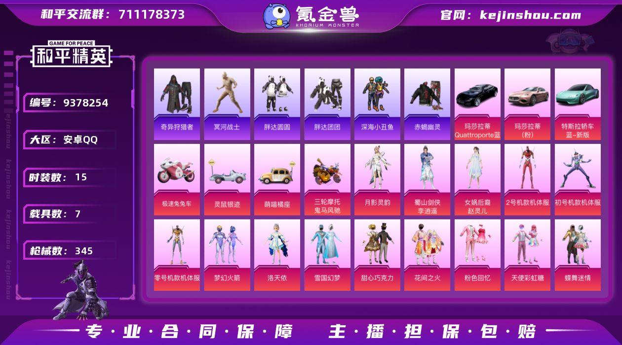安卓手Q-22王牌印记-有战神框-22粉装-9特效枪-3载具-热力值-272套装-353枪皮-4卓越印记-4传奇印记 【22粉装】,梦幻火箭,初号机款机体服,宝贝奶油派,天使彩虹糖,缤纷油彩,傲傲奶龙,黄族统领,海渊国主,小可学妹,猩猩队长,炙焰牛王,向日葵,寒光使者,莲影清波,银刃赛罗,极限特训,锦绣火鲤,暗夜鎏金,幻影战神,粉色回忆,星之彼岸,呆萌星弥 【9特效枪】AKM-炫紫旋律-5级 SCAR-L-梦幻火箭-7级 M416-五爪金龙-7级 M416-心之恋语-5级 AUG-超新星-6级 M762-激战未来-5级 Kar98K-巳巳如意-5级 UMP45-相思残雪-5级 P90-沙丘之主-3级 【1红装】,沙丘之主-图卡盟/2级, 【17稀有紫装】,都市猎人,派对舞王,赤蝎幽灵,萌熊伴侣背包(3级),奇异狩猎者,暗影哥特,深海小丑鱼,浪漫天命,雪山精英,浪漫波比,迅捷狂鲨,明日香款战斗服,龟仙人,金羽特工,六号树人,萌熊伴侣背包(2级),零款战斗服, 【3稀有载具】,阿斯顿·马丁DBS(绿),幻影随行,宾利欧陆GT敞篷(火焰橘), 【1僚机】,空客H135-蔚蓝之翼, 【272稀有时装】,图卡盟/2级,SS31特训,SS33特训,SS32特训,恋语绒绒,大橘大利,都市猎人,浪漫天命,奇异狩猎者,龟仙人,雪山精英,暗影哥特,深海小丑鱼,金羽特工,迅捷狂鲨,零款战斗服,明日香款战斗服,浪漫波比,六号树人,赤蝎幽灵,瑰梦爱神,派对舞王,顶瓜瓜,暗夜行者,好奇恐龙,激萌罗小黑,大橘为重,兔兔白日梦,动感兔斯基人偶服,狂沙舞者,酷熊伴侣,潮萌小黄鸭,Alan Walker,萌神柯基,龙魂突击队,异域银装,SS30特训,战术大师,SS28特训,银尘,机械英豪,机械征服者,SS29特训,SS16特训,华灯初上,暴风机械师,时空追击者,星际旅行,超人强,贝斯之夜,暗夜傀儡,红酒骑士,英勇保护者,智慧隐士,军械专家,冰爽风暴,源星混沌,福星高照,暗夜契约,纯白誓言,豚鼠丹丹,虎虎生威吉莉,夏日音浪,龙的传人,花园小羊咩,军刀雅典娜,潮酷猛小鳄,浓情摩卡,众神之