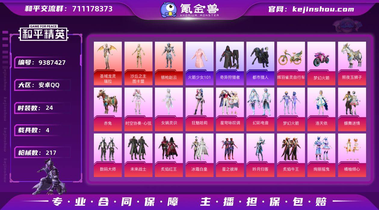 安卓手Q-1王牌印记-31粉装-24特效枪-4载具-93204热力值-122套装-217枪皮-0卓越印记-0传奇印记 【31粉装】,梦幻火箭,蝶舞迷情,洛天依,幻彩电音,星穹咏叹调,狂魅哈莉,时空协奏·心弦,蔷薇星,复仇流浪者,绚丽摇曳,橘柚倾心,炫光之旅,圣堂之誓,炙焰牛王,霁雪冰心,银红美神,妙趣可丽,女娲灵识,冰川幽秘,冰川红玫,旋转彩虹,冰霜白皇,炙焰红王,青空秋雨,启明星,暗夜鎏金,吟月归客,数码大师,未来战士,星之彼岸,呆萌星弥 【24特效枪】AKM-星际浪客-4级 SCAR-L-童趣迷兔-6级 SCAR-L-青春物语-1级 M416-超新星-9级 M416-至情至圣-7级 M416-心之恋语-1级 GROZA-旋转彩虹-6级 AUG-妙趣可丽-5级 AUG-星之彼岸-1级 Kar98K-巳巳如意-1级 Kar98K-圣域龙灵-3级 AWM-橘柚倾心-1级 AWM-花间之火-4级 AMR-炫光之旅-1级 M417-第五大道-1级 Vector-环太平洋-1级 P90-粉樱探戈-1级 P90-沙丘之主-5级 DP-28-暗夜鎏金-1级 MG3-洛神天依-5级 MG3-梦幻舞会-1级 MG3-辉羽雀灵-1级 MG-36-幻彩电音-1级 破片手榴弹-瓶中星球-4级 【1热门】,火箭少女101, 【3红装】,圣域龙灵-瑞拉/1级,沙丘之主-图卡盟/1级,角色-银枪赵云/1级, 【7稀有紫装】,都市猎人,2P战斗服款,2B战斗服款,萌熊伴侣背包(3级),奇异狩猎者,萌熊伴侣背包(2级),东方飞龙, 【4稀有载具】,辉羽雀灵自行车,赤兔,照夜玉狮子,双人摩托-梦幻火箭, 【122稀有时装】,火箭少女101,瑞拉/1级,银枪赵云/1级,图卡盟/1级,灵公主,极速光影,霓虹热舞,大橘大利,六号稻草人,都市猎人,奇异狩猎者,东方飞龙,圣穹绘梦,诡诞巡游,混沌火种,猎影月神,顶瓜瓜,2B战斗服款,2P战斗服款,暗夜行者,战术大师,明鸳圣池,忠义严颜,英勇保护者,水晶王族,童真绒兔,忠猛周仓,豚鼠丹丹,雪兔飞飞,龙的传人,军刀雅典娜,春野茶蘼,果汁能量,幻彩