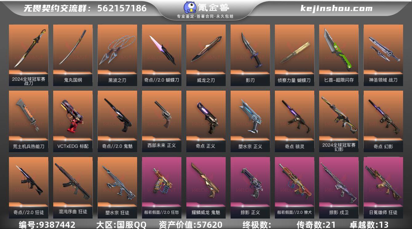 段位: 白银 亮点皮肤: 幻影-2024全球冠军赛,战刀-2024全球冠军赛 近战武器皮肤: 蝴蝶刀-侦察力量,黑波之刃,威龙之刃,匕首-超限闪存,蝴蝶刀-奇点//2.0,影刃,荒土机兵热能刀,鬼丸国纲,神圣领域 战刀 步枪皮肤: 幻影-奇点,狂徒-紫阙金琅,狂徒-塑水宗,狂徒-日冕雄师,狂徒-混沌序曲,狂徒-奇点//2.0,狂徒-掠影,戍卫-掠影,狂徒-般若假面//2.0,獠犬-般若假面//2.0 佩枪皮肤: 正义-奇点,正义-塑水宗,鬼魅-耀鳞威龙,标配-VCTxEDG,鬼魅-奇点//2.0,正义-掠影,狂怒-般若假面//2.0,正义-西部未来 狙击枪皮肤: 飞将-盖亚的复仇,冥驹-堕天遗武,冥驹-掠影 冲锋枪皮肤: 骇灵-奇点 机枪皮肤: 战神-般若假面//2.0