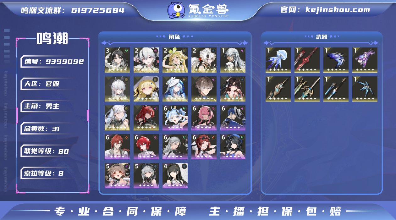 30黄,12金角色,九个金武器,一个皮肤,80级