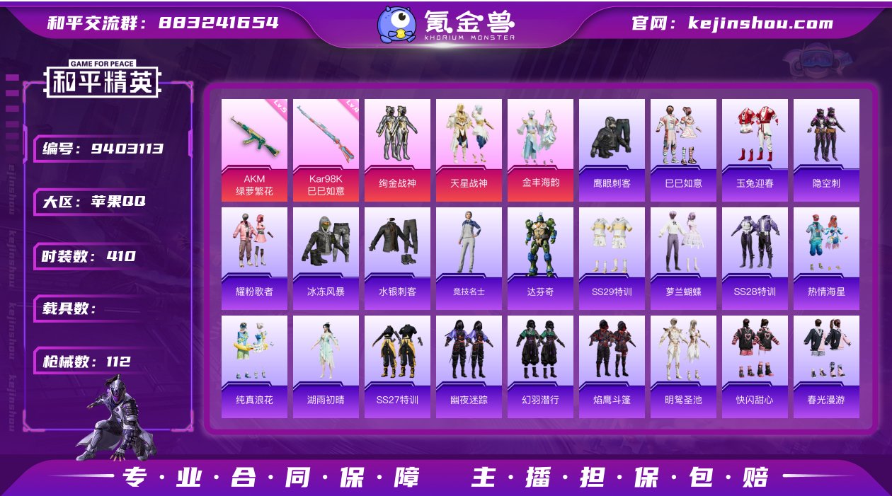 3粉装 2特效枪 8印记 可二次 可修改实名 热门装扮:绚金战神,天星战神,金丰海韵,鹰眼刺客 稀有枪皮:Kar98K-巳巳如意,AKM绿萝繁花 五级特效枪:五级AKM-绿萝繁花 四级特效枪:四级Kar98K-巳巳如意 紫色装扮:耀粉歌者,隐空刺,水银刺客,冰冻风暴,湖雨初晴,SS27特训,幽夜迷踪,纯真浪花,快闪甜心,明鸳圣池,幻羽潜行,焰鹰斗篷,热情海星,SS26特训,萝兰蝴蝶,SS29特训,达芬奇,SS28特训,春光漫游,惊鸿侠骨,锦衣飞扬,SS25特训,神气柴柴,懵萌河马,SS24特训(SS24特训套装),绚紫流光,竞技名士,玉兔迎春,巳巳如意 优质战备:炫光之旅降落伞,未来歌姬降落伞,垂柳戏鸭降落伞,白勺歌姬降落伞,甜心宝贝降落伞,至尊龙雀降落伞