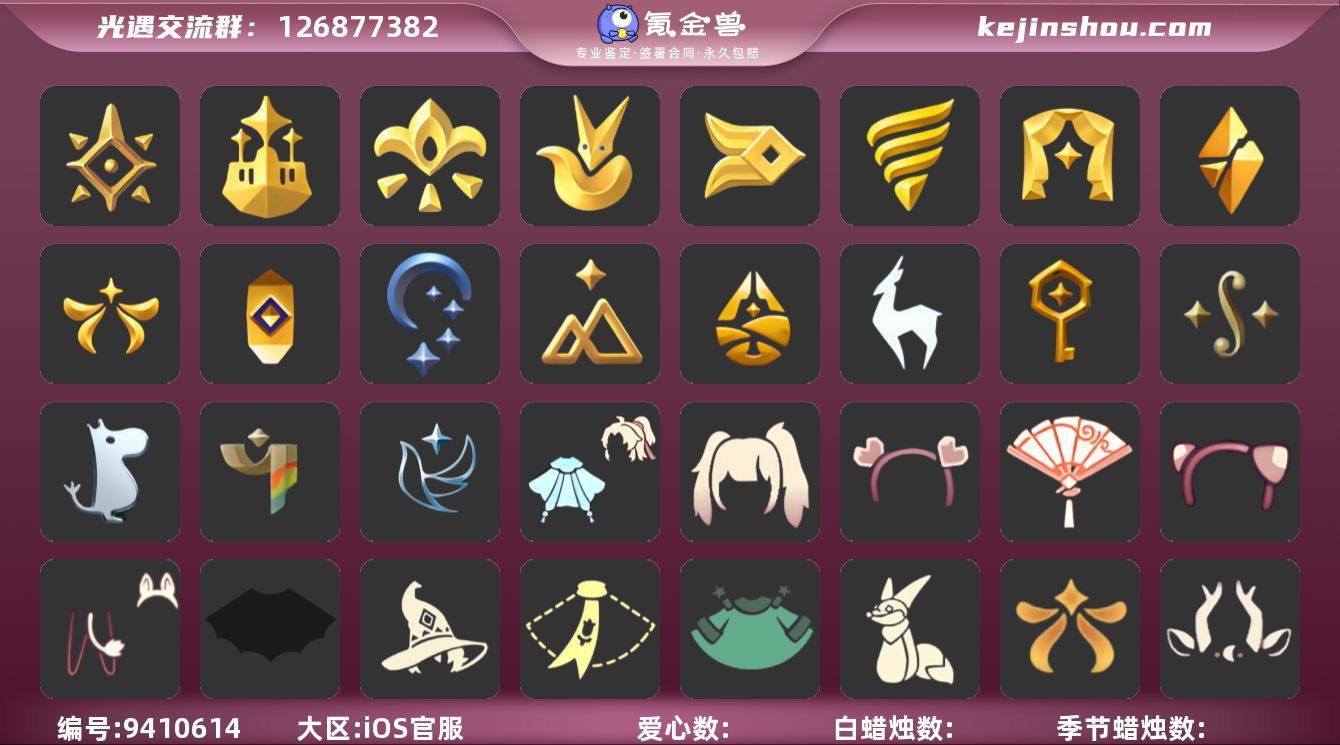 账号类型: 手机账号 季节已毕业: 预言季,梦想季,小王子季,风行季,潜海季,表演季,破晓季,欧若拉季,集结季,夜行季,追忆季,拾光季,归巢季,九色鹿季,筑巢季,二重奏季,姆明季,彩染季,青鸟季 完成地图: 晨岛,云野,雨林,霞谷,暮土,禁阁,全图毕业 珍稀物品: 阿努比斯(狗头),白枭,透明蝶翼斗,玫瑰花 礼包: 蝙蝠套,巫师,围巾,星球斗,小狐狸,欧若拉之翼,九色鹿角,莲花斗,大耳狗装扮,绊爱,大铁头,鹿角,荷叶伞,牛仔裤,兔子鞋,运动鞋,白绒金,福娃,灯笼,风之旅人,人声乐器,奔跑发型,鲤鱼套,雪花球,橘子,粽叶,贝壳,黄伞,红伞,兔子,南瓜,雪花,鲤鱼,水母,猫背饰,星月头饰,彩虹耳钉,彩虹耳机,新年裤,蝴蝶结,魔法棒,奥利奥,四叶草,暗彩装扮,向日葵套,拖鞋,爱心眼镜,透明蛛丝,浪漫流星斗,飞鸟纸伞,满月耳坠,姆明饰品套装,献瑞折扇礼包,渐变双马尾发型礼包,心心相印发饰礼包,粽子发饰礼包,青衫落拓礼包 裤子: 武士裤,背带裤,白棉裤,搓澡巾 面具: 黄鼠狼,红狐狸,阿努比斯 面饰: 红耳机 项链: 围巾 发型: 蝴蝶结,正太,樱花,公主头,虚荣,猫耳 头饰: 花环 斗篷: 白金,红金,白鸟斗,花瓣斗篷,荧蓝斗篷 配饰: 雨伞,排箫,高音钢琴,吉他,笛子,大铃铛乐器,乐器 亮点: 重塑药水97,有青鸟季季卡