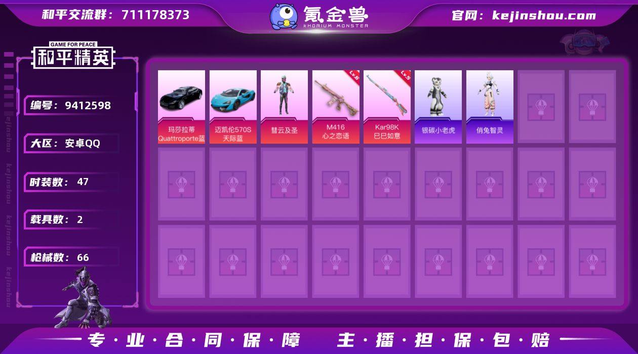 实名: 可修改 时装数: 47 载具数: 2 枪械数: 66 热门装扮: 彗云及圣,银碳小老虎 载具: 玛莎拉蒂Quattroporte(夜幕蓝),迈凯伦570S(天际蓝) 稀有枪皮: M416心之恋语,Kar98K-巳巳如意