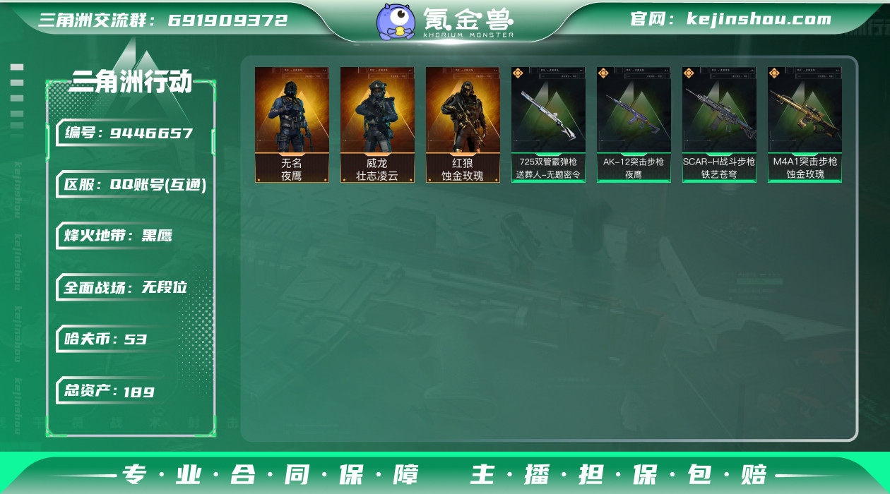 hf6263 总资产189m+纯币53m+饰金玫瑰红狼全套+s3s4s5赛季通行证+烽火等级60 特勤部门等级可以 永久包赔