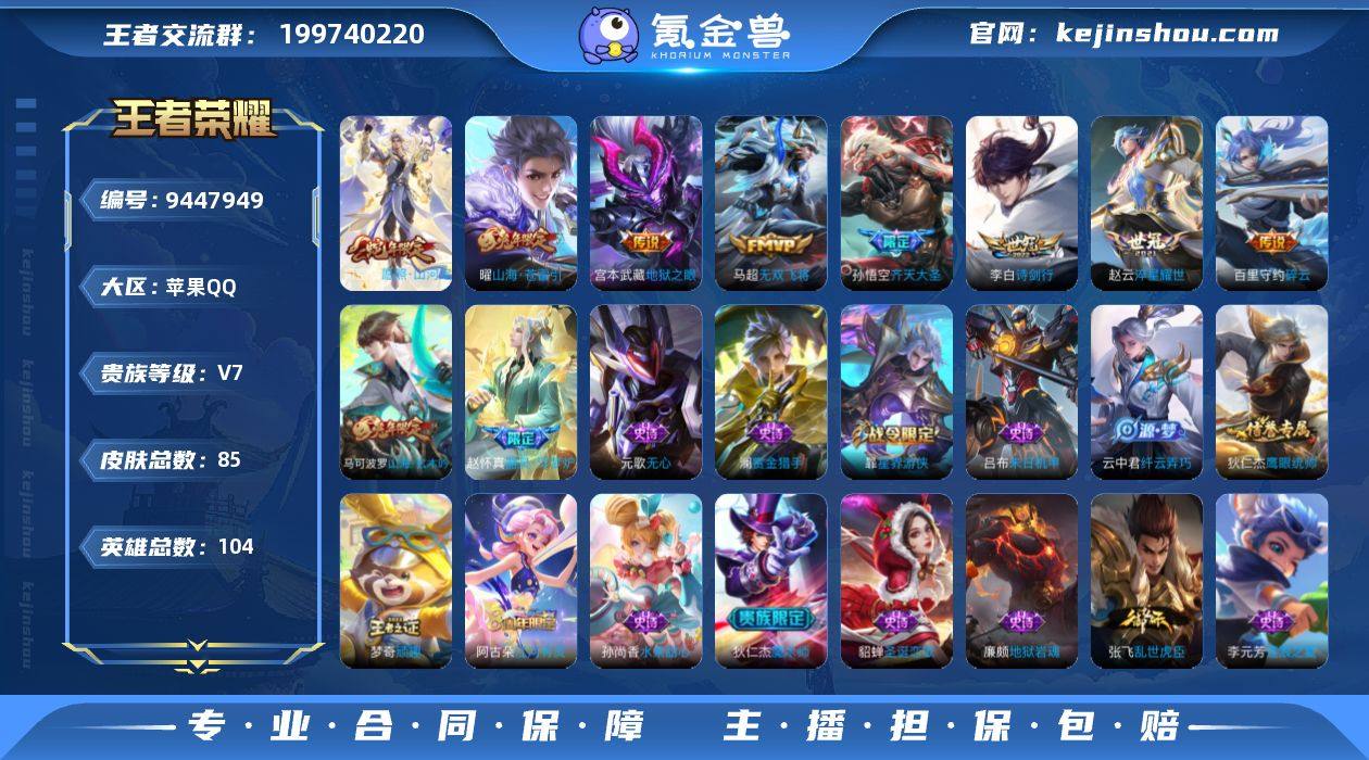 -可二次-104英雄-85皮肤-8传说-17史诗 【传说】淬星耀世-赵云 愿照·山河定-司空震 碎云-百里守约 诗剑行-李白 地狱之眼-宫本武藏 无双飞将-马超 【传说限定】齐天大圣-孙悟空 山海·苍雷引-曜 【史诗】赏金猎手-澜 鹰眼统帅-狄仁杰 顽趣-梦奇 器灵·浮梦炉-赵怀真 水果甜心-孙尚香 逐浪之夏-李元芳 地狱岩魂-廉颇 皇家上将-赵云 末日机甲-吕布 圣诞恋歌-貂蝉 魔术师-狄仁杰 乱世虎臣-张飞 【史诗限定】星界游侠-暃 纤云弄巧-云中君 山海·玄木吟-马可波罗 无心-元歌 江河有灵-阿古朵 【勇者】劲辣红锅-太乙真人 龙腾万里-关羽 时尚教父-姜子牙 铁骨偃魂-典韦 乐园追猎者-白起 太极少年-赵怀真 坚韧之力-苏烈 拳王-达摩 黄金武士-典韦 破局者-亚连 幻泉雾影-海月 海盐诗旅-桑启 天穹祈灯-鬼谷子 群星魔术团-程咬金 汉昭烈帝-刘备 噬灭天穹-东皇太一 云中旅人-李元芳 擒涛扼浪-裴擒虎 死亡骑士-亚瑟 蔚蓝守将-蒙恬 阿尔法小队-后羿 天使之翼-孙膑 雾都夜雨-干将莫邪 剑破天穹-刘邦 阴阳师-狄仁杰 漠中幻影-嫦娥 忍·炎影-赵云 完美运算-后羿 白色死神-白起 街头霸王-韩信 古海寻踪-张良 纽约教父-刘备 【其他】归虚梦演-曜 碧珀绯影 魅影绮裳 灼热之刃 冰刃幻境 激情绿茵 异域舞娘 三太子 潮流仙人 孤猎 启蛰 街头旋风 海滩派对 第七人偶 熊喵少女 特种部队 创世神祝 圣殿之光 暖冬·兔眠 林狼骑-苍 午夜歌剧院 画中游 功夫老勺 赤焰之缨 棒球奇才 西部大镖客-孙悟空 战争骑士 魇语军师