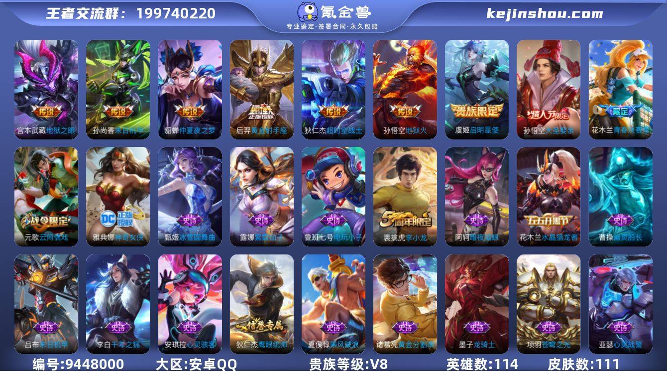 -可二次-114英雄-111皮肤-7传说-27史诗 【传说】超时空战士-狄仁杰 黄金射手座-后羿 末日机甲-孙尚香 地狱之眼-宫本武藏 启明星使-虞姬 地狱火-孙悟空 仲夏夜之梦-貂蝉 【史诗】暗夜贵公子-嬴政 苍穹之光-项羽 电玩小子-鲁班七号 魅力维加斯-妲己 黄金分割率-诸葛亮 暗夜猫娘-阿轲 圣诞狂欢-吕布 心灵骇客-安琪拉 圣诞恋歌-貂蝉 德古拉伯爵-刘邦 魔术师-狄仁杰 鹰眼统帅-狄仁杰 幽灵船长-曹操 心灵战警-亚瑟 千年之狐-李白 乘风破浪-夏侯惇 水晶猎龙者-花木兰 冰雪圆舞曲-甄姬 龙骑士-墨子 皇家上将-赵云 末日机甲-吕布 紫霞仙子-露娜 【史诗限定】李小龙-裴擒虎 青春决赛季-花木兰 大圣娶亲-孙悟空 缤纷独角兽-小乔 云间偶戏-元歌 【勇者】万事如意-刘备 未来纪元-宫本武藏 景韶洛都-明世隐 谧流熔炉-太乙真人 演武夺筹-程咬金 混沌棋-弈星 白执事-赵云 少女阿狸-妲己 阴阳师-狄仁杰 虹云星官-明世隐 万华元夜-狄仁杰 鲨炮海盗猫-沈梦溪 街头霸王-韩信 御狮-狂铁 龙腾万里-关羽 兔女郎-花木兰 疑决卦-明世隐 化身博士-扁鹊 潮玩骑士王-亚瑟 御霄-米莱狄 灵卦秘语-少司缘 驱傩正仪-钟馗 万象初新-宫本武藏 星梦巡礼-姜子牙 瓷语鉴心-露娜 死亡骑士-亚瑟 穷奇-典韦 重明-芈月 无双福将-程咬金 虚灵犬护-钟馗 教廷特使-韩信 海滩丽影-钟无艳 朔风刀-夏侯惇 次元突破-哪吒 原初探秘者-鬼谷子 霸王丸-宫本武藏 烛龙-曹操 饕餮-太乙真人 白色死神-白起 纽约教父-刘备 【其他】生化警戒 归虚梦演-蒙犽 玫蓝誓约 醍醐杖 修竹墨客 踏雪寻梅 维京掠夺者 海滩派对 布丁狗之约 锦衣卫 荷鲁斯之眼 精准探案法 绝影神枪 花见巫女 功夫老勺 神奇女侠 魇语军师 尼罗河女神 灵野札记 冰刃幻境 激情绿茵 威尼斯狂欢 潮流仙人 加勒比小姐 启蛰 伊势巫女 年年有余 极冰防御线 龙域领主 街头旋风 第七人偶 熊喵少女 创世神祝 花间舞 天启骑士 西部大镖客-孙悟空 剑舞者