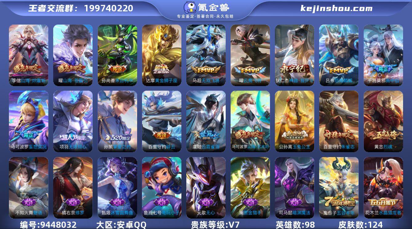 -可二次-98英雄-124皮肤-14传说-40史诗 【传说】碎云-百里守约 末日机甲-孙尚香 云霓雀翎-虞姬 云鹰飞将-曜 黄金狮子座-达摩 无双飞将-马超 怒海麟威-吕布 【传说限定】山海·苍雷引-曜 挚爱之约-孙策 神器·狴犴令-狄仁杰 山海·炽霜斩-李信 画中仙-干将莫邪 妄想实况-马可波罗 无限倾心-项羽 【史诗】电玩小子-鲁班七号 逐浪之夏-李元芳 原初追逐者-百里玄策 猫狗日记-孙策 无限星赏官-公孙离 魅语-不知火舞 圣诞狂欢-吕布 末日机甲-莱西奥 鬼剑武藏-宫本武藏 金属风暴-墨子 魔术师-狄仁杰 赏金猎手-澜 鹰眼统帅-狄仁杰 顽趣-梦奇 水果甜心-孙尚香 舞动绿茵-蔡文姬 绅士熊喵-刘禅 箭羽风息-伽罗 水晶猎龙者-花木兰 冰雪圆舞曲-甄姬 修罗-橘右京 皇家上将-赵云 荣光圣徽-蒙恬 星夜王子-白起 末日机甲-吕布 真我赫兹-百里守约 暗渊魔法-司马懿 【史诗限定】朱雀志-百里守约 黎明之约-雅典娜 五谷丰年-鬼谷子 山海·玄木吟-马可波罗 烈魂-黄忠 匿光侦查者-李元芳 玉兔公主-公孙离 吟游魔法-明世隐 百解令-蒙犽 游园惊梦-甄姬 无心-元歌 江河有灵-阿古朵 蔷薇恋人-孙尚香 【勇者】时空谍影-海诺 探海日志-鲁班大师 危途狂花-戈娅 妄想特派-李元芳 金庭之子-兰陵王 乐园追猎者-白起 太极少年-赵怀真 海盐诗旅-桑启 天穹祈灯-鬼谷子 暗都幽影-大司命 云中旅人-李元芳 擒涛扼浪-裴擒虎 特工战影-狂铁 聚星闪耀-钟无艳 潮玩探月行-猪八戒 天穹之誓-姜子牙 阴阳师-狄仁杰 大漠名商-沈梦溪 完美运算-后羿 鲨炮海盗猫-沈梦溪 古海寻踪-张良 龙腾万里-关羽 沉稳之力-孙尚香 化身博士-扁鹊 黄金武士-典韦 西部游侠-莱西奥 幻泉雾影-海月 沙漠行僧-达摩 群星魔术团-程咬金 掌控之力-诸葛亮 西部大镖客-牛魔 大发明家-达摩 剑破天穹-刘邦 熔金海岸-周瑜 夜都怪侠-白起 幻乐之宴-鬼谷子 忍·炎影-赵云 白色死神-白起 纽约教父-刘备 【其他】归虚梦演-蒙犽 精灵王 灼热之刃 孤猎 归虚梦演-西施 踏雪寻梅 维京掠夺者 秩序猎龙将