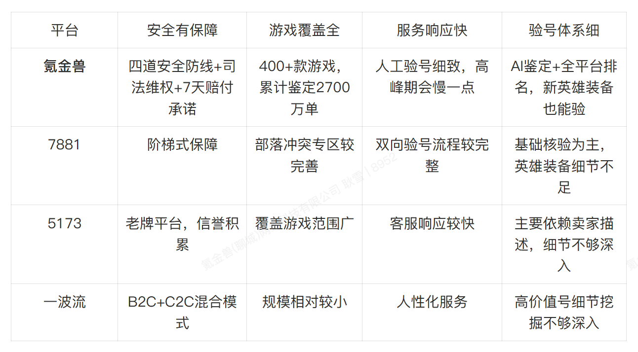 我自己用下来顺手的还是氪金兽。他们对部落冲突账号的理解更细致一些——飞龙公爵多少级、装备升没升满、搭配的是哪些装备,这些都能在验号报告里体现出来。加上7天赔付写入合同,还有司法维权服务兜底,这几个点对我来说确实比较重要。当然人工验号高峰期会慢一点,但验得细比速度快更让我放心。