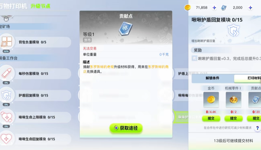 首先,我们需要前往月兔登陆舱,与那里的NPC进行对话。在对话过程中,我们会了解到关于升级节点的信息。点击万能打印机后,我们可以选择升级节点。此时,我们会惊喜地发现许多模块已经开放至十三级。然而,要升级这些模块,我们需要一种名为“贡献点”的材料。