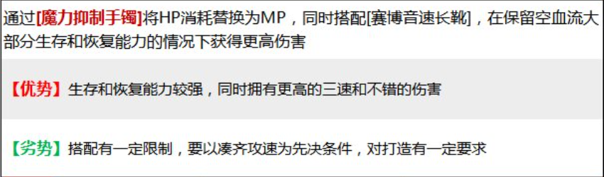 配装特点:这种搭配通过魔力抑制手镯将HP消耗替换为MP,同时搭配赛博音速长靴,在保留空血流大部分生存和恢复能力的情况下获得更高伤害。这种搭配能够在保持佣兵的生存能力的同时,提高其输出能力。