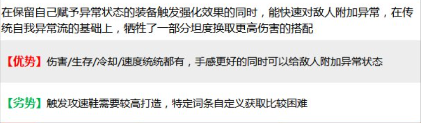 配装特点:这种搭配在保留自己赋予异常状态的装备触发强化效果的同时,能快速对敌人附加异常,在传统自我异常流的基础上,牺牲了一部分坦度换取更高伤害。这种搭配能够让佣兵快速对敌人附加异常状态,提高输出能力,但会牺牲一部分生存能力。