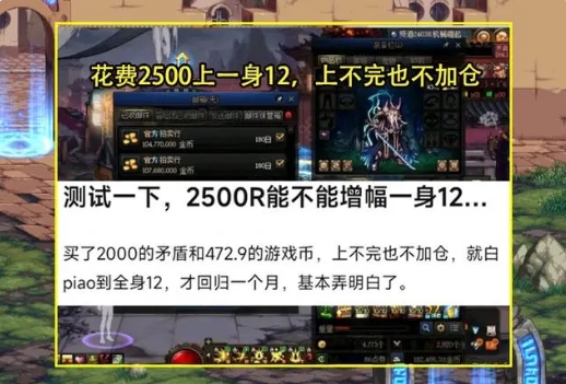 在《地下城与勇士》(DNF)这款游戏中,增幅打造一直是玩家们追求的重要目标之一。对于许多平民玩家来说,一身红12的打造更是梦寐以求的终极目标。近日,一位回归玩家在打团一个月后,发现红12的面板能带来更好的游戏体验,于是决定将自己的角色打造一身红12。他购买了2000R的矛盾和473R的游戏币,准备用这些资源来测试一身红12的可行性。然而,实际测试的结果却让他大失所望。