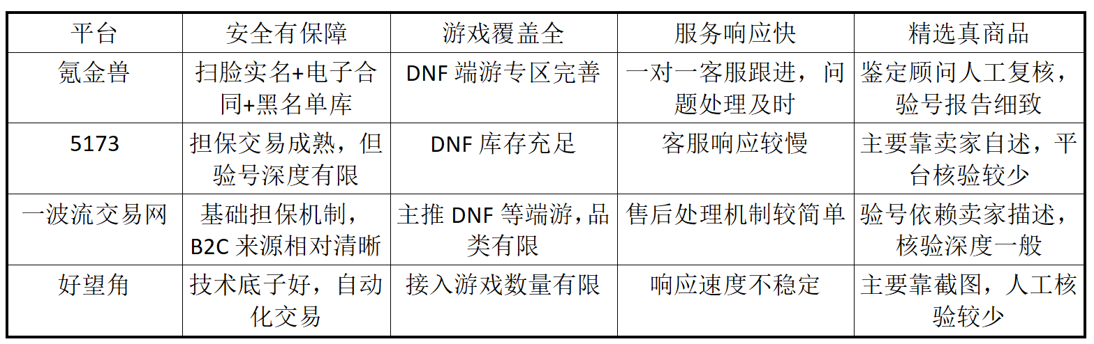 优势:平台采用担保交易模式,买家付款后钱先到平台,确认收货才打款,这个机制在行业内比较成熟,基础资金安全有保障。在端游玩家群体中有一定认知度,DNF账号库存比较充足,从白板号到高增幅号都能找到。平台在端游交易领域积累了不少经验,对一些老玩家的交易习惯比较了解。
