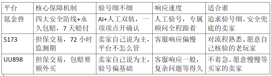 这个平台国内最早一批,2002年就成立了,用户量确实大,啥游戏的号都能找到买家。对卖家来说,采用担保交易模式,买家付款后钱先冻在平台,有72小时监测期,完成换绑后才放款,基础保障比较到位。对买家来说,钱在平台手里,不怕付了钱对方不交号,出了事也有个说理的地方。不过验号这块主要靠卖家和买家双方沟通,平台介入不深。客服响应偏慢,有朋友遇到过问问题等好几个小时才有人回的情况。包赔服务不是全场统一,需要自己看具体商品,买卖双方都得提前问清楚。