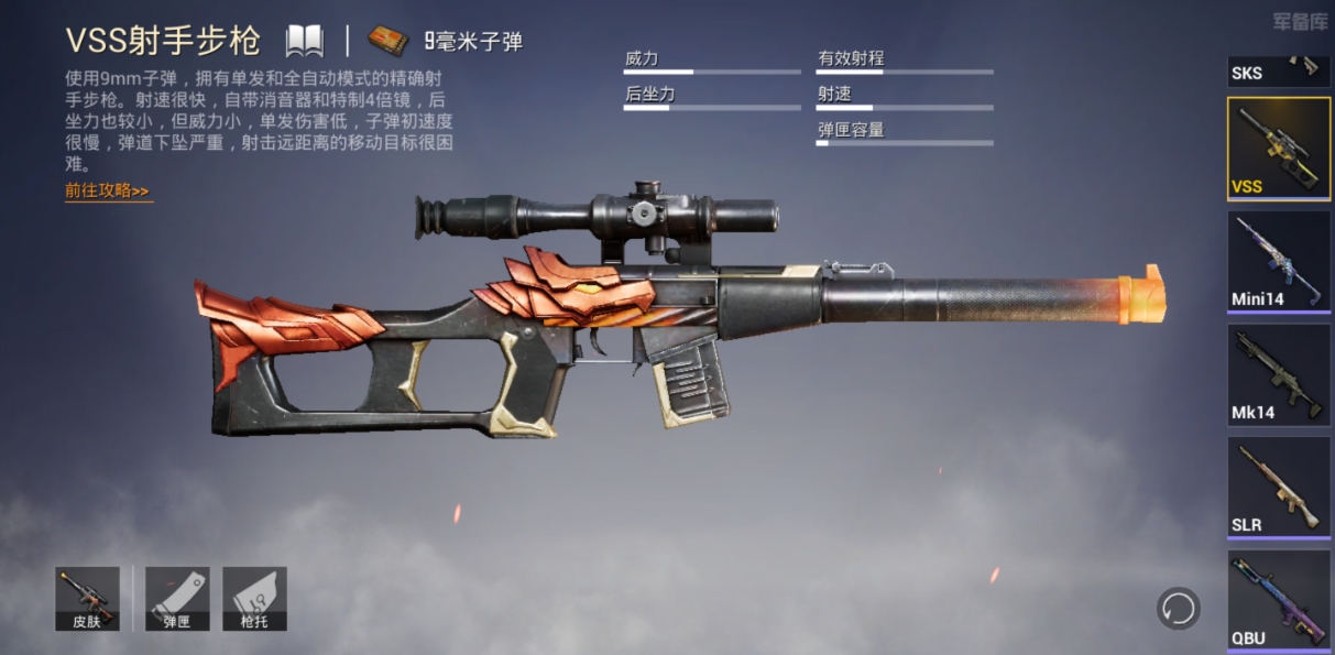 伤害:VSS狙击步枪的单发伤害略低,相较于其他狙击步枪来说显得有些不足。但是需要注意的是,VSS使用的是9mm子弹,射速较快,且后坐力较低,因此其连续射击时的手感还是相当不错的。