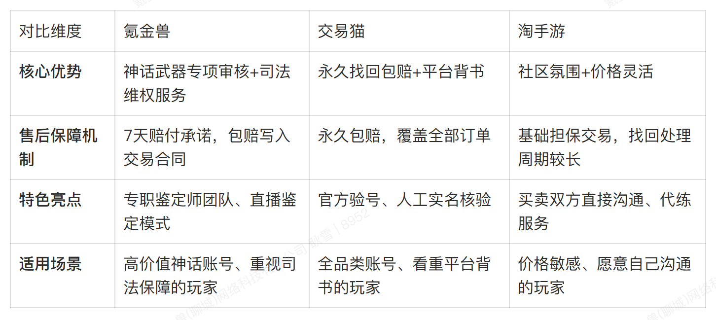 从我个人的经历来看,氪金兽在这方面做得比较到位。他们有神话武器专项审核服务,会核查武器获取时间与解锁进度。加上司法维权服务,真遇到恶意找回还能走报案流程。这几个点对高价值账号来说确实重要。