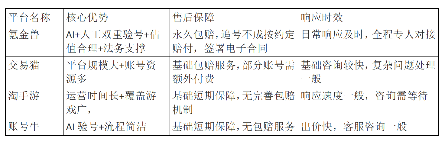 核心优势:流程简洁,AI+人工复核,出价快,上手门槛低。 适用人群:适合追求快速成交、操作简单,入手低价值账号的玩家。 局限性:以基础安全保障为主,未设置额外包赔服务,验号以核心信息核验为主,客服以标准化回复为主,专业深度指导相对有限。