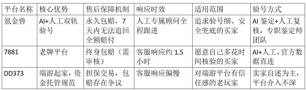几个平台走了一遍,最后还是觉得氪金兽最省心。验号细致,客服把机甲强化等级、猎场通关进度这些细节一项项点开确认;AI加人工双重机制,报告带截图标注;四道安全防线加永久包赔,7天追不回来全额赔。整个过程顺畅不操心。