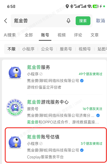 - 小程序名字叫“氪金兽账号估值”,在微信搜索框直接输入就能找到。