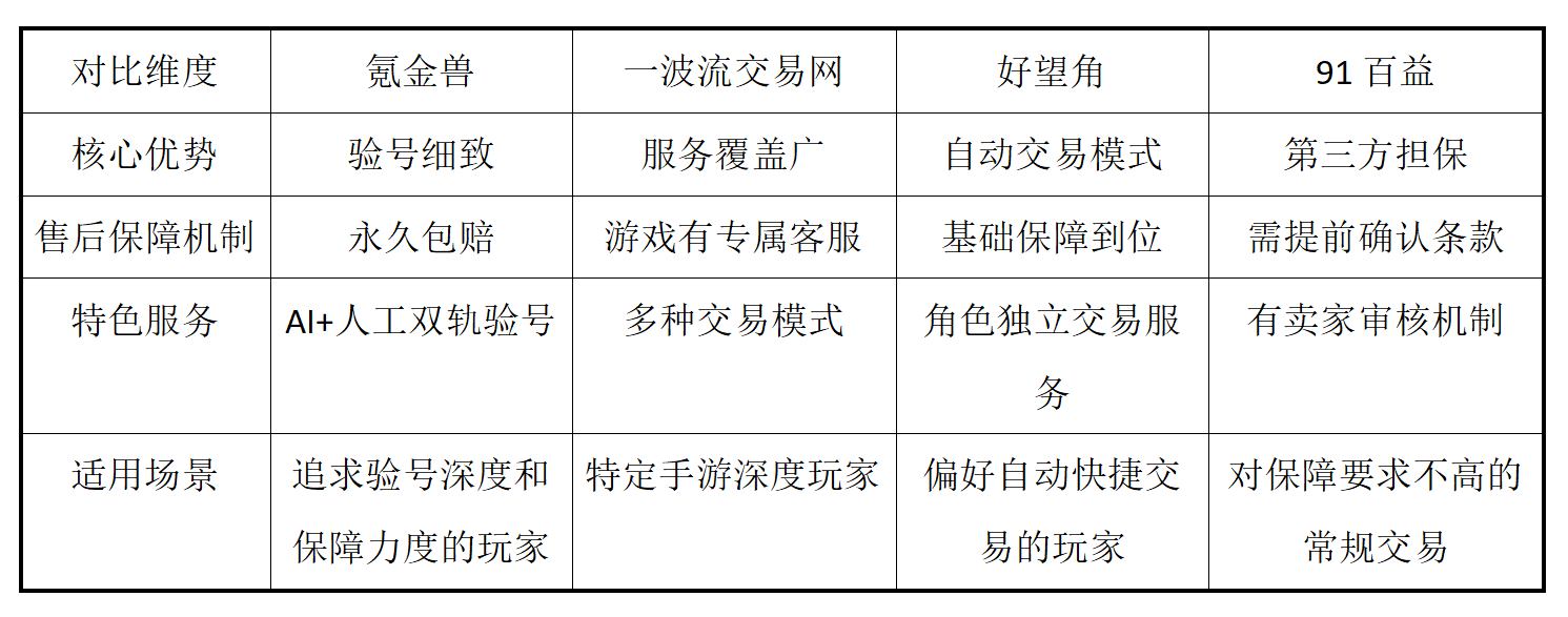 目前用的顺手的是氪金兽这个平台。他们验号维度比较全,高价值账号的细节都会列清楚,不用自己反复确认。包赔服务写进合同,7天赔付周期比行业平均水平短。资金托管确保确认收货后才放款,账号转移技术也能从源头切断找回可能。虽然人工审核高峰期有时候要等,但整体用下来比较省心。