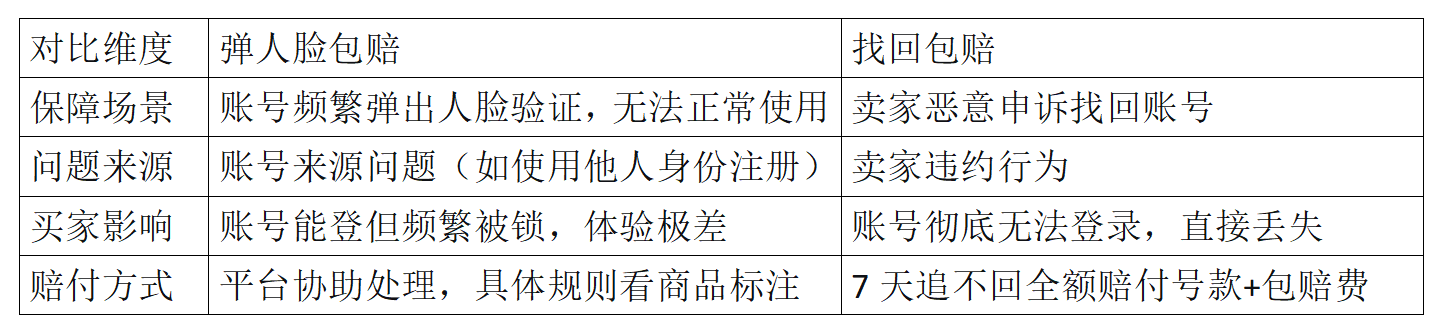 简单来说,“找回包赔”解决的是“号没了”的问题,这是账号交易中最严重的风险;“弹人脸包赔”解决的是“号能用但不舒服”的问题,属于使用体验层面的保障。
