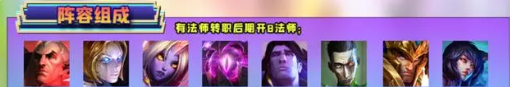 前期过渡:在2-1阶段有恶魔耀光符文时,可以考虑确定该阵容。使用4法师+2巨神峰过渡,尽量走连胜开局。优先合成斯维因的石像鬼石板甲,保证前期的抗伤能力。