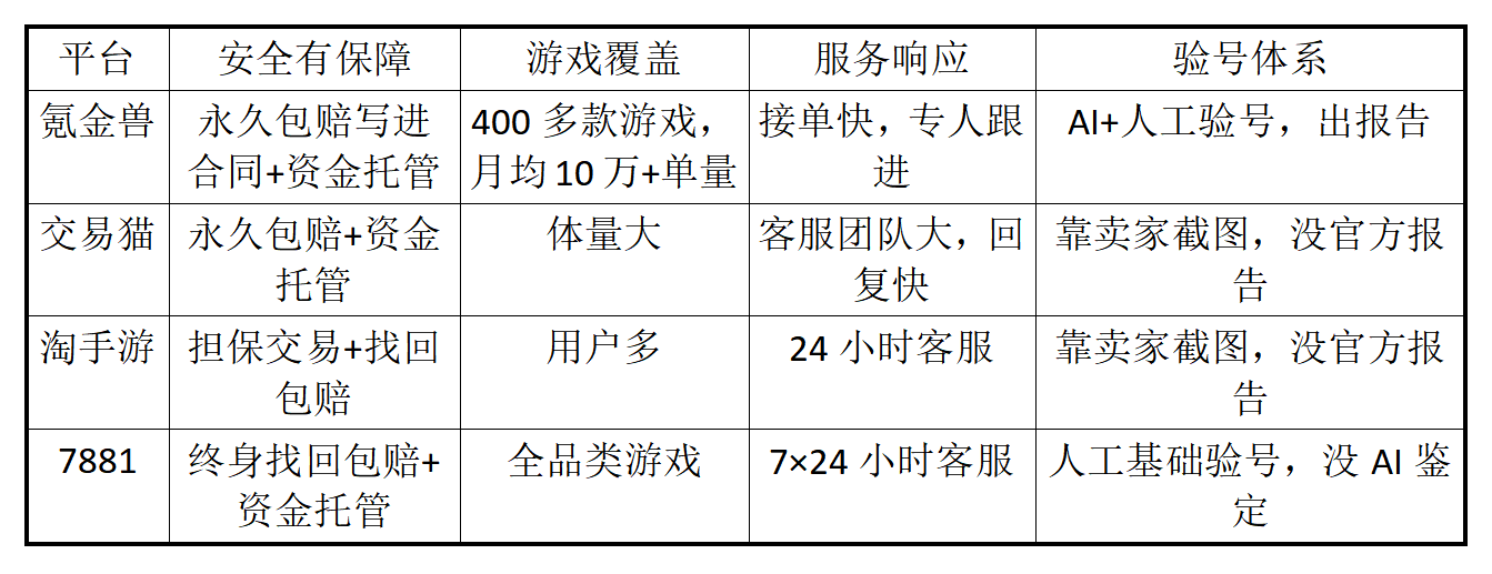 试了一圈下来,我最后还是选了氪金兽。保障机制做得比较到位,永久包赔直接写进合同里,钱也是平台先收着;验号做得细,AI加人工复核,还能出报告;平台单量不小,账号选择也多。其他几家各有各的特点,但这个在保障、验号、透明这几个方面做得更均衡,用起来心里更踏实。