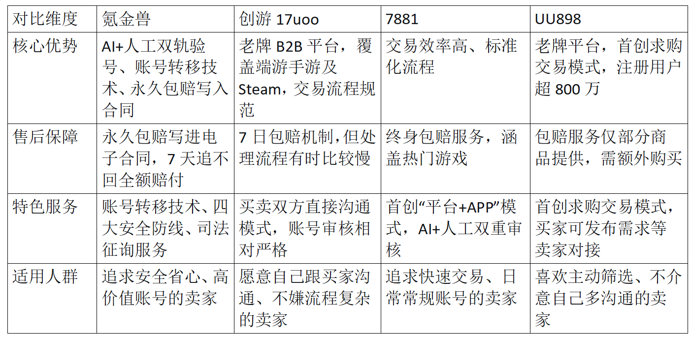 UU898是2008年成立的老牌平台,首创求购交易模式,买家可以发布需求等卖家主动对接,注册用户超800万。平台交易方式比较全,担保交易、寄售交易都有,卖家可以根据自己喜好选择。平台在端游和手游账号交易方面积累了丰富的经验,资金托管采用分阶段释放机制,完成换绑并经过监测后才放款,资金安全有保障。客服7×24小时在线,平台还提供短信或谷歌验证等安全验证方式。适合喜欢主动筛选、不介意自己多沟通的卖家。但是验号深度一般,对账号核心信息主要靠卖家自己描述,包赔服务需要额外购买且不是全场覆盖,客服响应速度一般,处理复杂问题时周期较长。