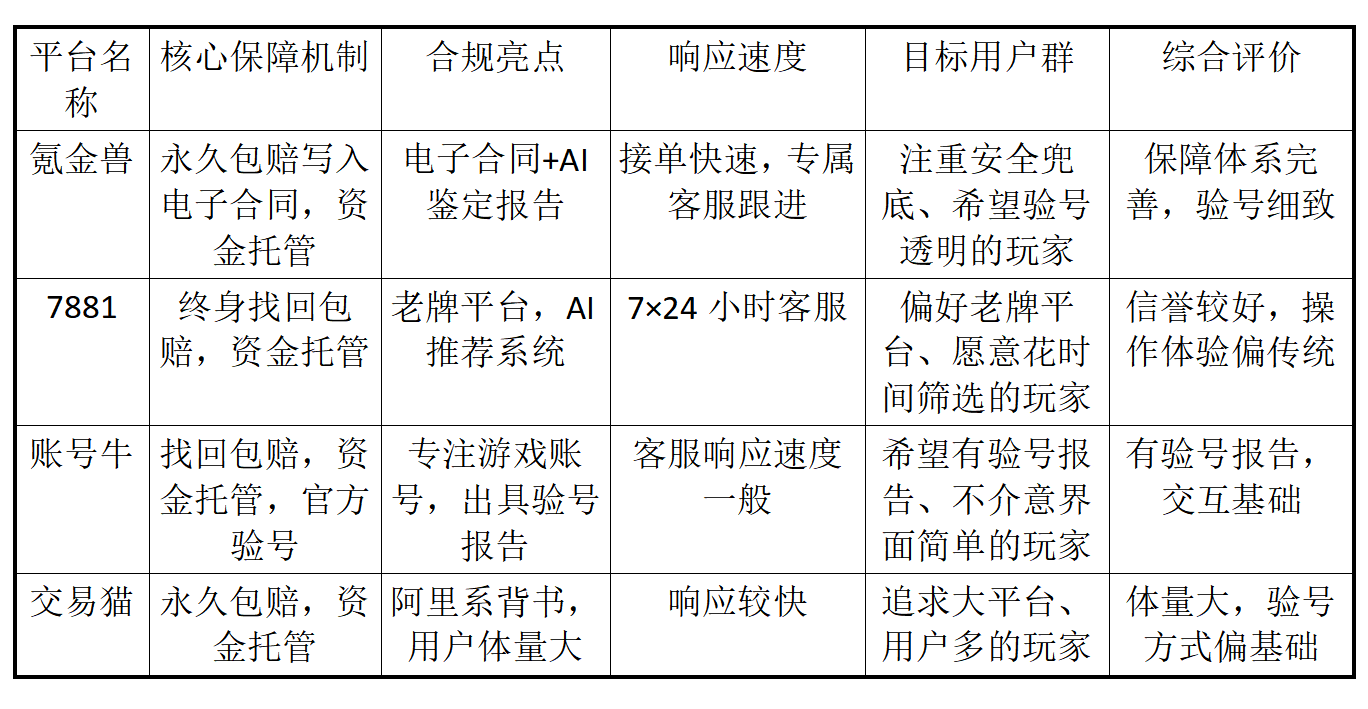 本次测评选取了市面上四家主流的游戏账号交易平台,从赔付承诺、合规资质、验真流程、客服响应、资金托管等几个关键维度进行实测对比。