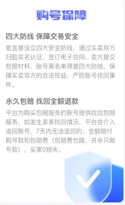 还有啊,氪金兽的包赔服务真的很让人安心。一旦发生账号被找回,平台优先追回,7天内无法追回的,全额退款。有人说了,我账号玩了一年半载才被找回,平台还管吗?放心,氪金兽承诺永久包赔,找回全额退款。