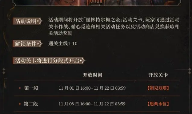活动将分为三个阶段进行。第一阶段是“朝见双塔”,预计在11月1日开放。这一阶段将包含大约9个关卡,玩家们需要面对的是相对简单的敌人,适合快速适应和熟悉新活动模式。同时,这一阶段也是获取活动道具和资源的好时机,为后续的挑战做好准备。
