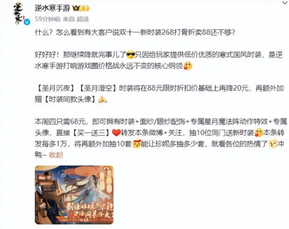 而将这套思路玩明白了的《逆水寒》手游也是再度官宣要趁着双十一将游戏外观价格再打骨折!原价268的外观现在只需要68元,而且还是买一送三的顶配!这一举措无疑会让更多的玩家们加入到游戏中来,同时也进一步提升了游戏的营收水平。看来这波购物节前后,《逆水寒》手游的营收又要再度暴涨了!