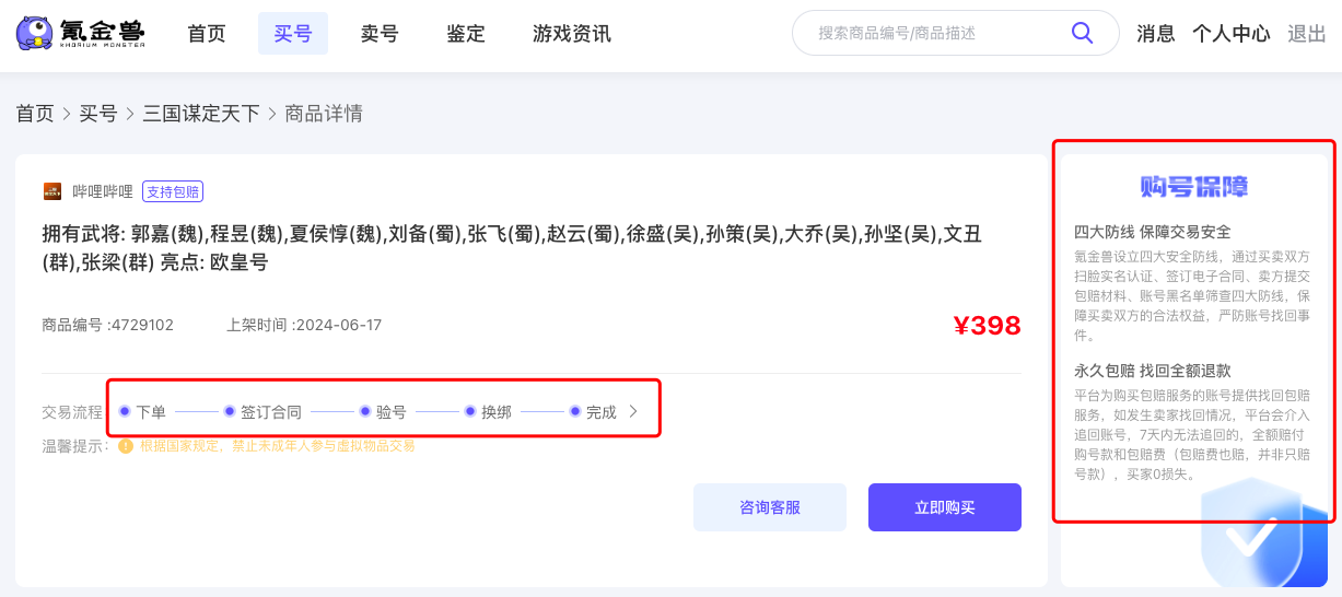 而且啊,氪金兽的交易流程真的是一目了然,下单、签合同、验号、账号换绑,每一步都专业又有保障。最让人安心的是,他们还提供永久包赔服务,一旦账号出现问题,就能全额退款,这样的服务简直是太给力了。